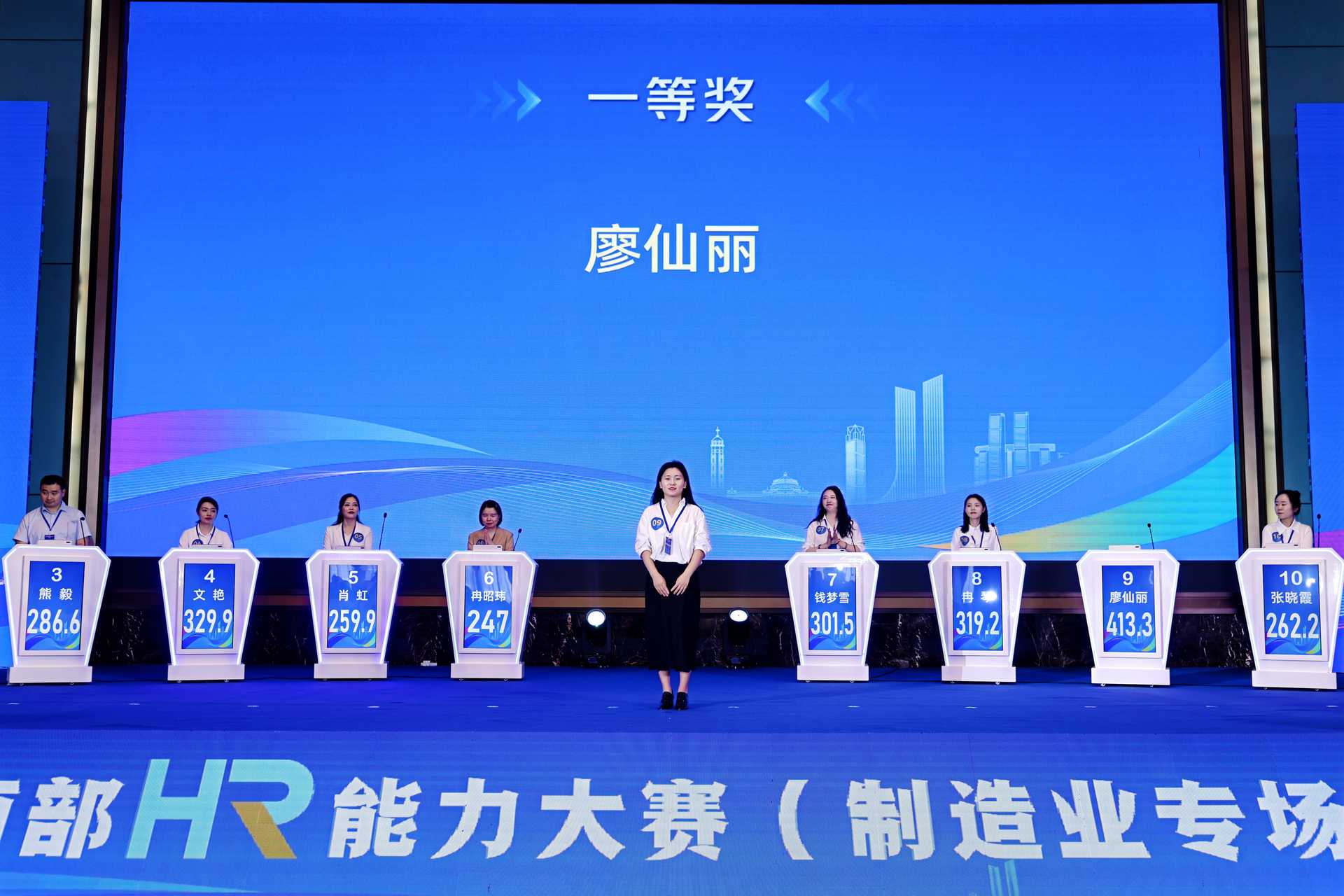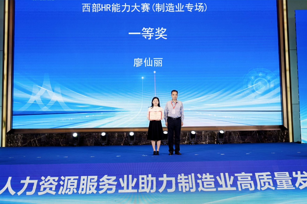 大赛共设置“初赛—复赛—决赛”三轮竞赛流程,自9月8日启动,历经17天白热化角逐,最终于9月24日圆满收官。赛事全程竞争激烈,初赛阶段便吸引西部地区4837名HR精英参与,仅36名参赛选手获得复赛入场券。在9月19日举行的复赛中,廖仙丽以第二名的佳绩成功晋级决赛。9月24日决赛按照“比赛+路演”模式进行,设置“初露锋芒”“眼疾手快”“百舸争流”“涅槃跃升”四个环节,涵盖理论竞答、抢答淘汰、智能制造实际案例解决方案展示等多种形式,廖仙丽与来自西部各地的11位顶尖人力资源管理者展开巅峰对决,并凭借扎实的人才战略理论功底及优异临场发挥勇夺桂冠。